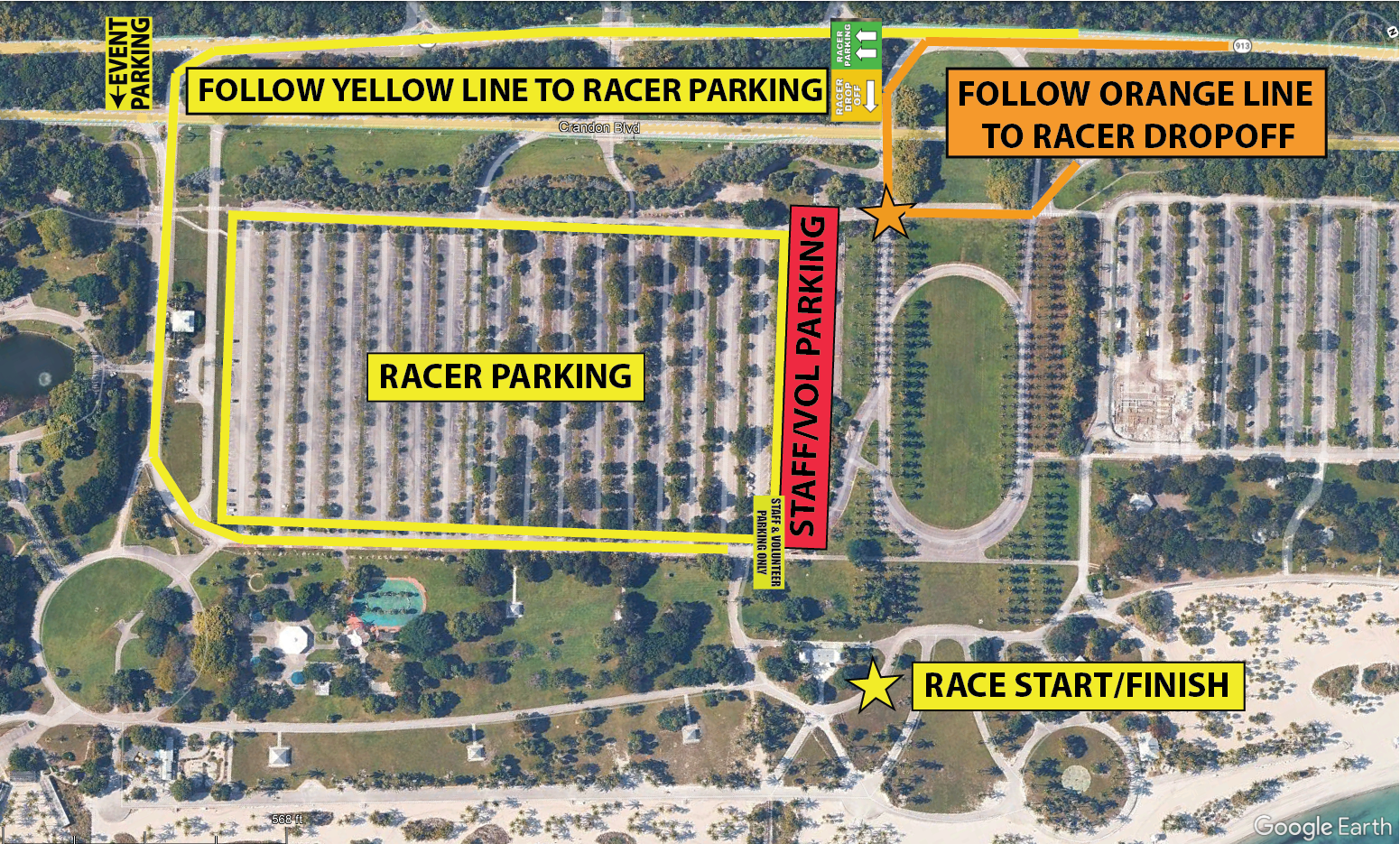 For ATHLETE PARKING, follow the yellow line into the parking lot. For RACER DROP OFF, follow the orange line to the drop off area. There will be a yellow and green barricade, as included on the above map, on Crandon Blvd indicating when to turn left or keep straight.
